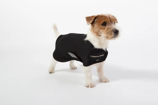Täcket är justerbart vid krage, bröst och mage för en bekväm och säker passform. Reflexdetaljer på båda sidor gör hunden mer synlig i mörker. För hundar med hög svansisättning finns även en praktisk dragkedja baktill. Den stilrena designen kompletteras av en broderad Back on Track-logga på kragen.