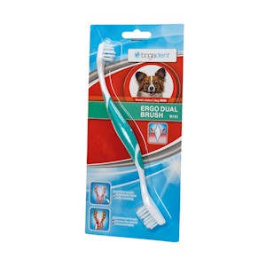 Bogadent Ergo Dual Brush Mini är en tandborste till små hundar för enkel och effektiv tandborstning. När plack och tandsten byggs upp, särskilt runt kindtänderna, kan det orsaka skada på både tänder, tandkött och den stödjande bindväven. Därför bör sällskapsdjurs tänder borstas regelbundet, helst dagligen eller minst 2-3 gånger i veckan. Ergo Dual Brush Mini kan användas för små hundar och den lilla borsten kan användas för katter.