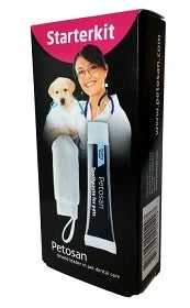 Petosan Starter Kit för hund innehåller en tub med 20 g tandkräm med kycklingsmak och en fingertandborste av mikrofiber. Tandkrämen motverkar uppkomsten av tandsten hos hunden.